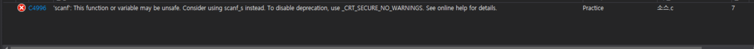 Visual Studio에서 scanf를 쓰게 되면 다음과 같은 오류가 뜹니다.