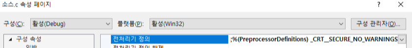 혹은 소스파일의 [속성]-[구성 속성]-[C/C++]-[전처리기]-전처리기 정의 에다가 한 칸 띄고 _CRT__SECURE_NO_WARNINGS을 적으시면 됩니다.