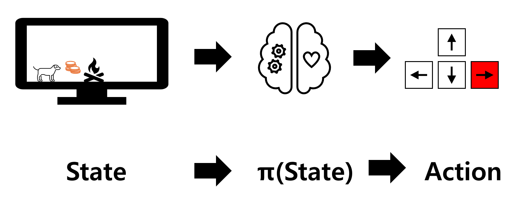 The Policy π: 에이전트의 뇌. 현재 상황, 특정 시간에 에이전트가 어떻게 행동할 지를 정한다.