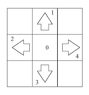 DDR은 아래의 그림과 같은 모양의 발판이 있고, 주어진 스텝에 맞춰 나가는 게임이다. 발판은 하나의 중점을 기준으로 위, 아래, 왼쪽, 오른쪽으로 연결되어 있다. 편의상 중점을 0, 위를 1, 왼쪽을 2, 아래를 3, 오른쪽을 4라고 정하자.