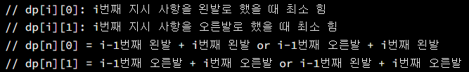 현재 지시 사항에 왼발 혹은 오른발을 했을 때의 최소 힘은, 이전 지시 사항에서의 최소 힘일 때의 경우를 고려해서 계산할 수 있다.