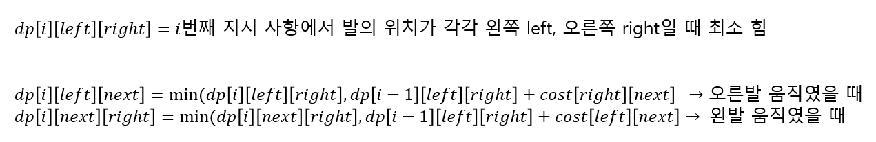 그래서 처음에 2차원 dp 배열을 만들어서 "dp[i][foot] = i번째 지시 사항을 왼발/오른발로 했을 때 최소 힘" 이라고 정의했다. 그리고 점화식은 아래처럼 이전 값을 사용해서 나타내었다.