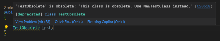 Obsolete 키워드는 선언 바로 윗 부분에 [System.Obsolete]를 적어 적용할 수 있다.