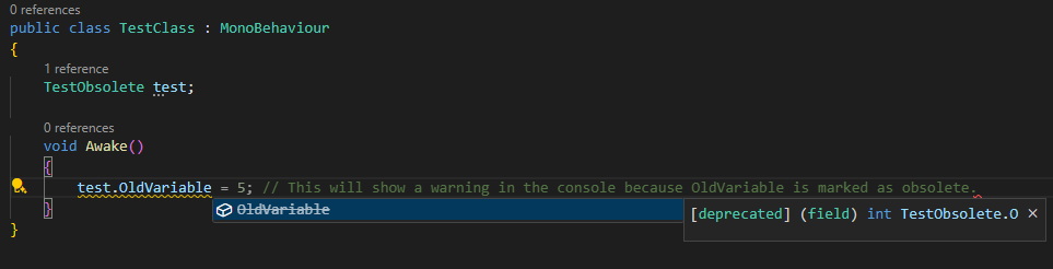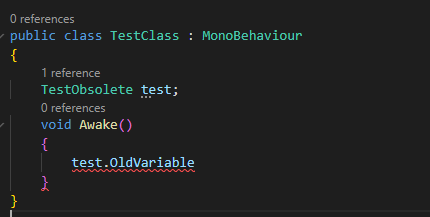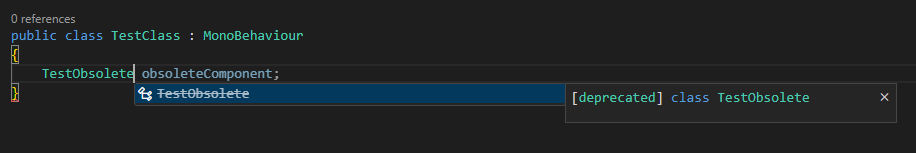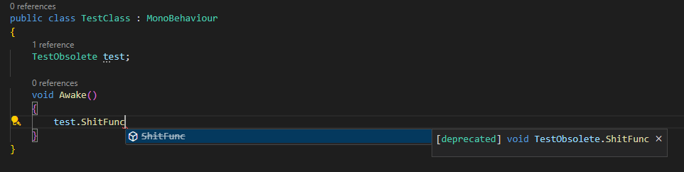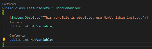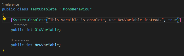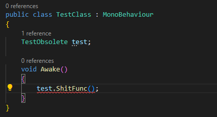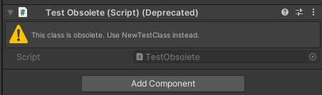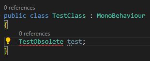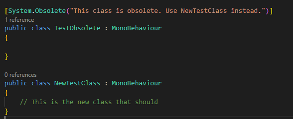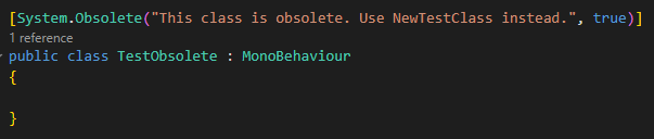이를 위해 Unity에서는 더 이상 사용하지 않는 함수나 클래스에 Obsolete 키워드를 넣어 해당 함수나 클래스가 더 이상 권장되지 않음을 표시할 수 있다.