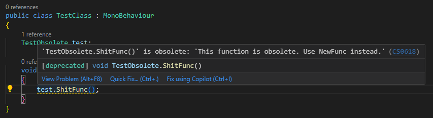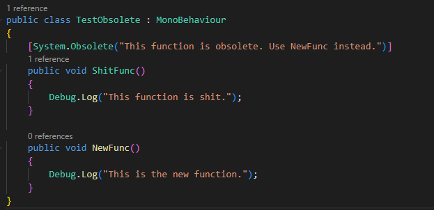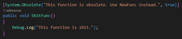 ShitFunc를 만들고 Obsolete 키워드를 넣으면 다른 클래스에서 접근할 때 표시가 된다.