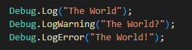 Debug 종류는 Log, LogWarning, LogError 3가지로 각 상황에 따라 적절하게 사용한다.