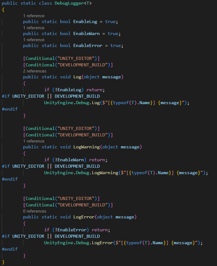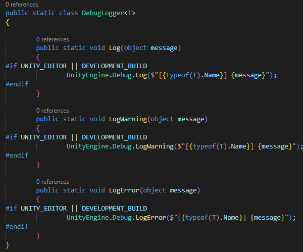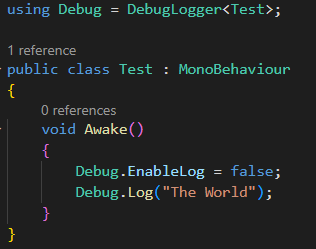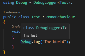 이후 사용하려는 클래스에서 코드 맨 위에 using Debug = DebugLogger<원하는 클래스>; 를 적어주면 된다.