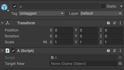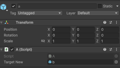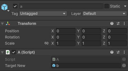 스크립트 A는 다음과 같이 public Gameobject Target 변수를 가지고 있으며, 인스펙터에서 프리팹 b를 할당해주었다.