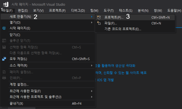 다음과 같이 화면이 나왔으면, 왼쪽 위에 파일-새로만들기-프로젝트 순서로 눌러주세요.