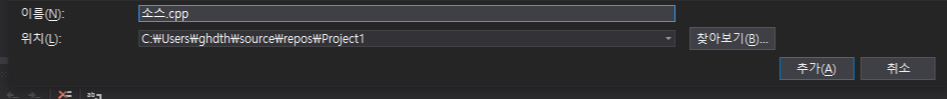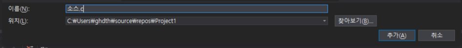 저희는 C 코드를 작성할 것이므로, 확장자를 cpp에서 c로 바꿔줍시다. 이후 추가를 누르시면 소스를 생성됩니다.