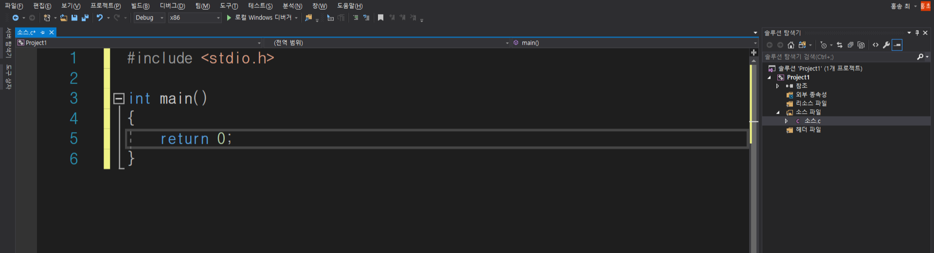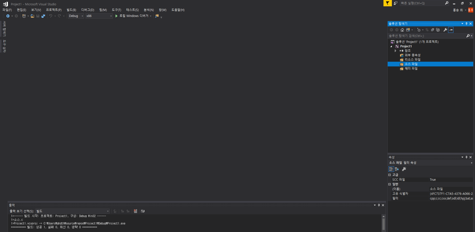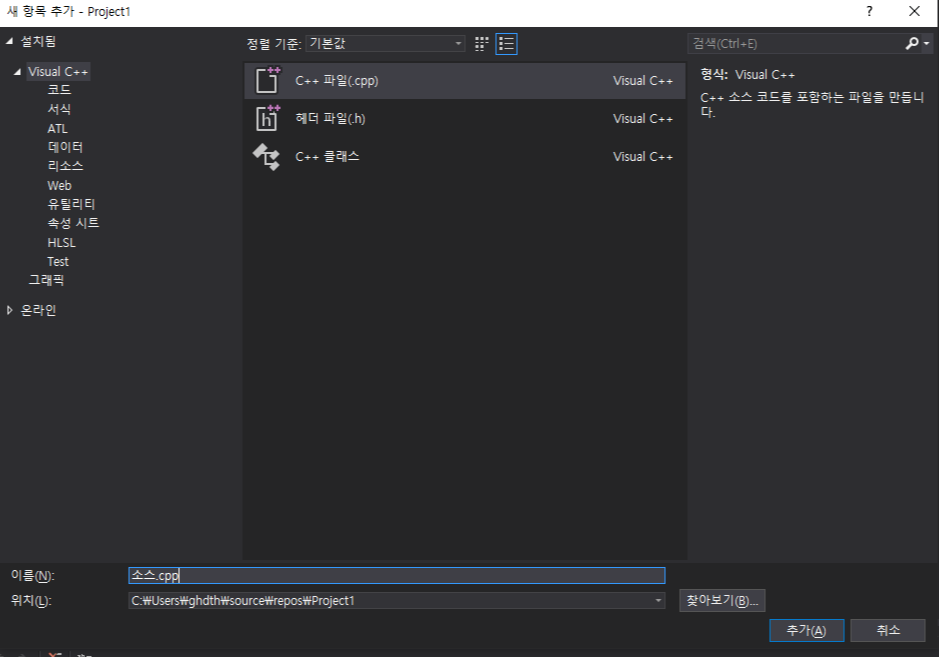 그 후 보시면 소스 파일의 확장자가 cpp로 되어있을겁니다. 이는 C++소스 코드를 작성한다는 것을 의미합니다.