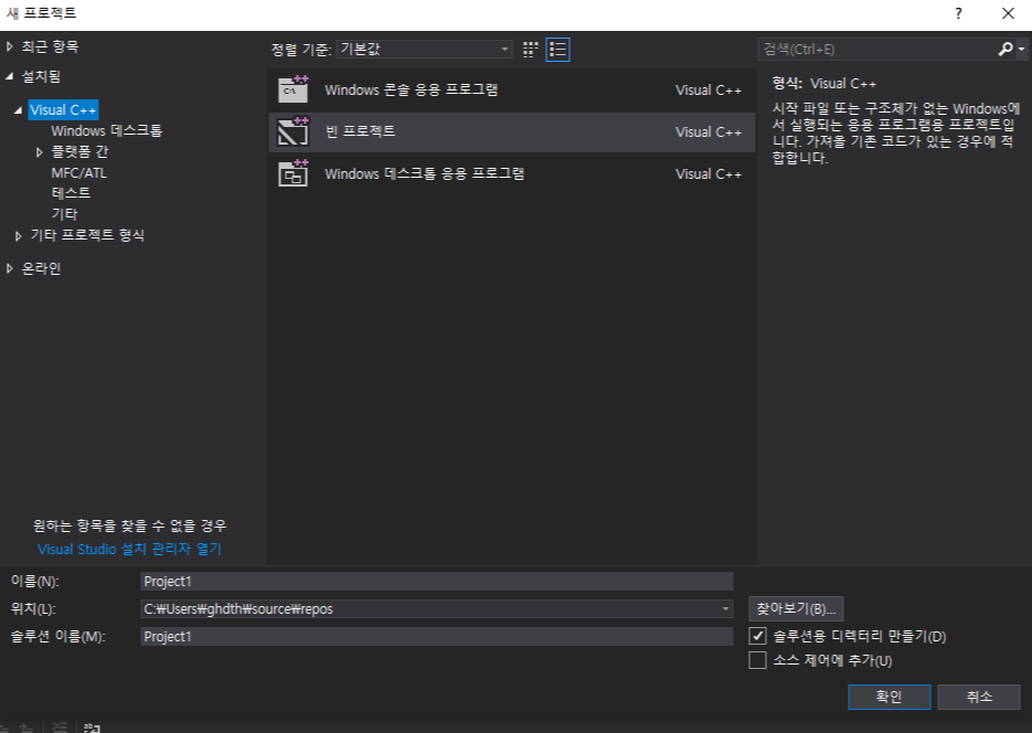 여기서 빈 프로젝트를 선택해 주시고 이름은 자유롭게 작성하시면 됩니다