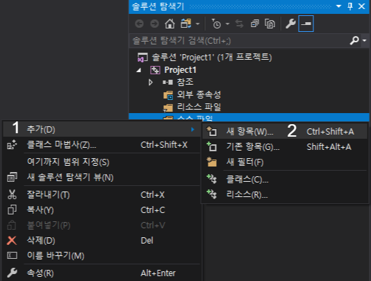 이후 소스 파일을 선택, 우클릭 한 후 추가-새 파일 순서로 클릭해줍시다.
